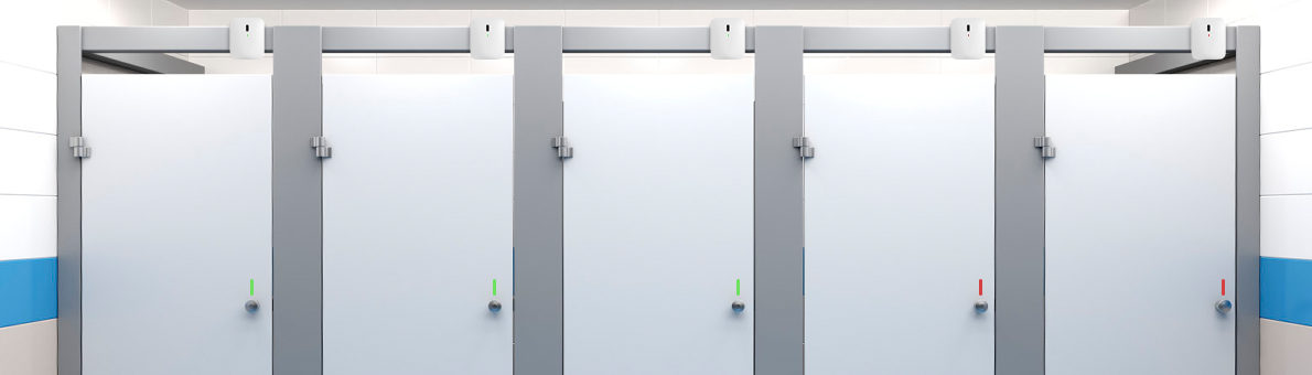 厕位引导系统Toilet Guidance System系统由人体传感器或智能门锁和有无人指示灯这两种设备组成,设备间进行无线通信,当人体传感器检测到有人时或者智能门锁上拴时,表明该隔间有人正在使用中,指示灯将亮起红色,显示有人,当隔间使用时,指示灯为绿色,显示无人;支持将卫生间使用状况同步上传至“瑞沃智慧卫生间系统”的电脑端、手机APP端、卫生间可视化大屏。